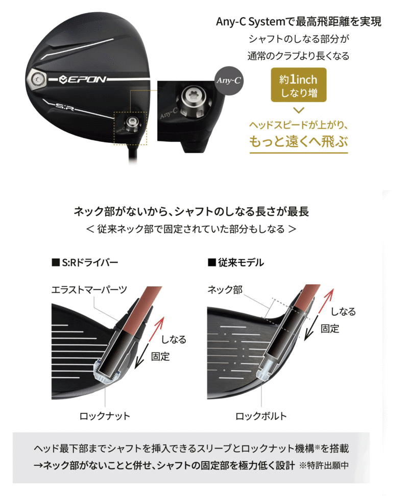 EPON[S:R ドライバー][S:R LD ドライバー]は、エポン独自のテクノロジー[Any-C System]は、かつて[AK-26 ドライバー]でも採用されていましたが、今回の[S:R ドライバー]ではソール部にロックがあり、さらにシャフトの先端をしならせるために、ネック部を失くしてしまう大胆なヘッドデザインとなっています!(※見た目のためにゴムネックあります)