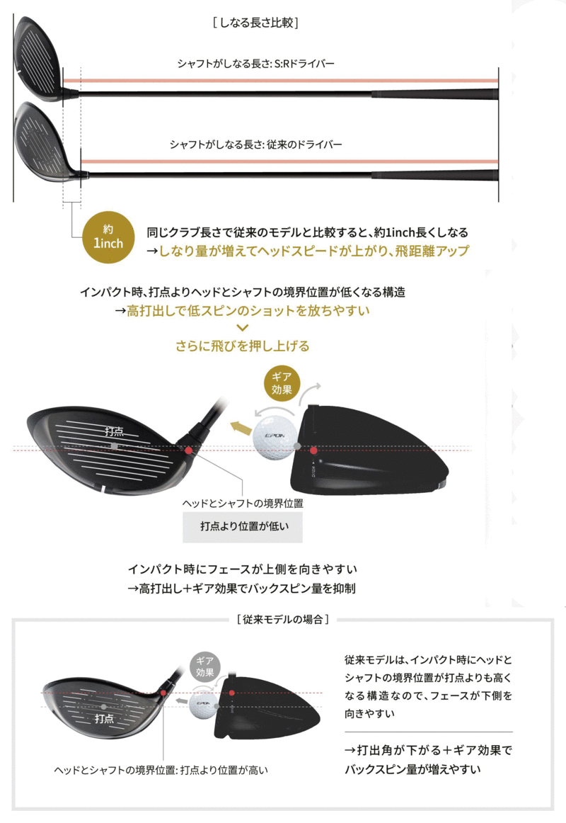 ドライバーヘッドのソールまで シャフトがほぼ貫通する形で、ボールのヒットポイントが通常のヘッドよりも高い位置になり、ヘッドのギア効果で高い打ち角度が得られるのと同時に、ボールのバックスピン量を抑制されます!つまり、遠くに飛ばすための“大砲”のようなドライバーです↑↑