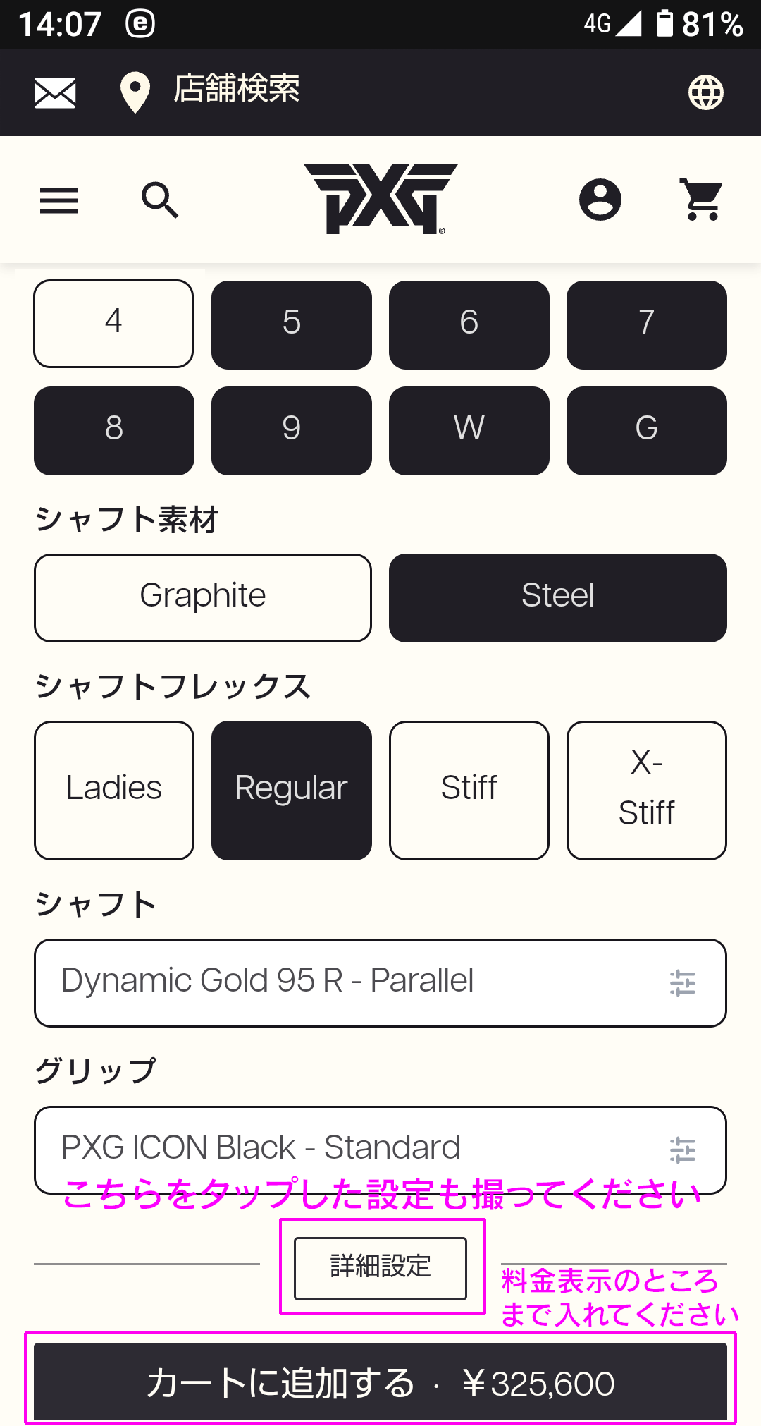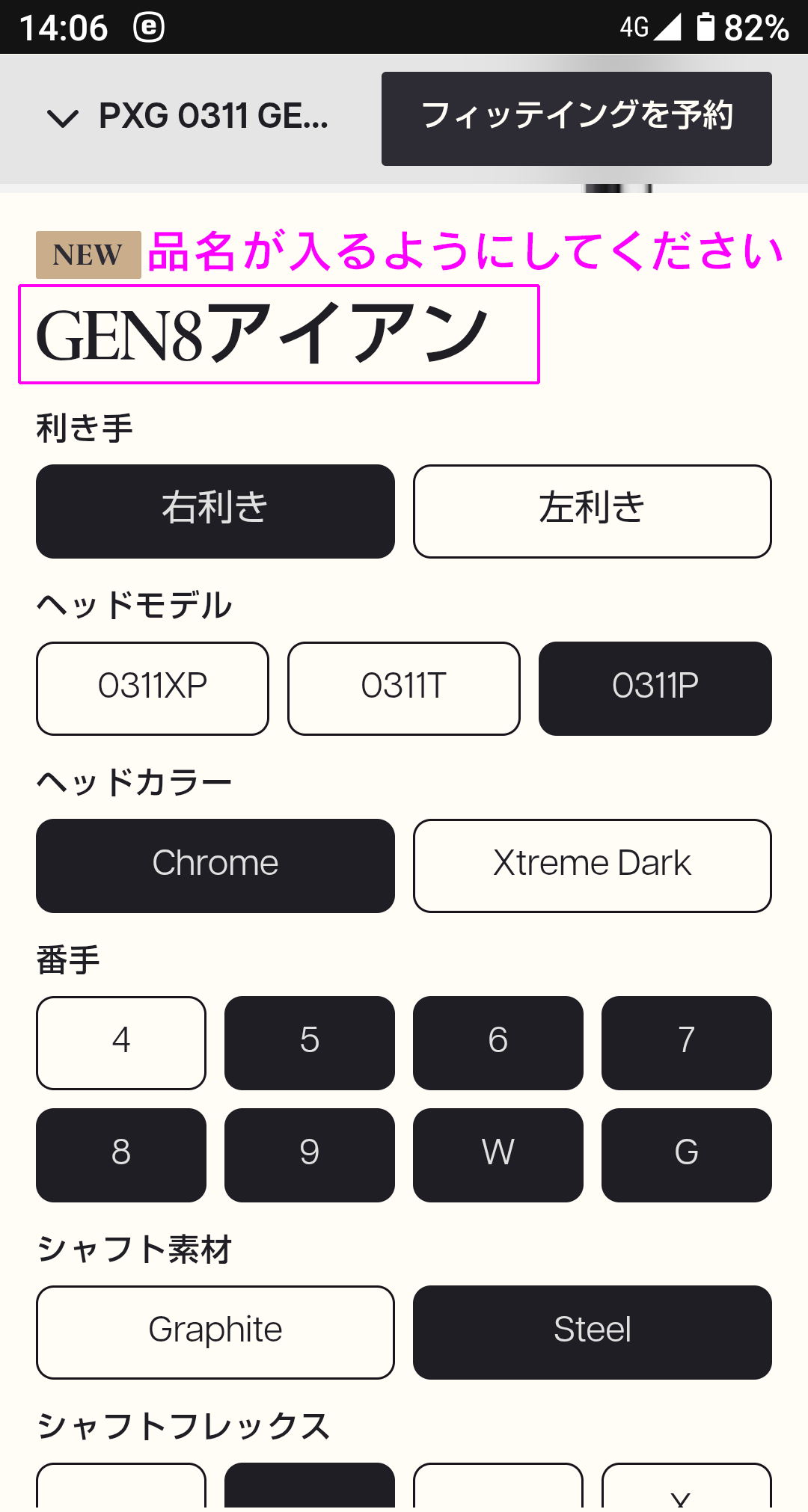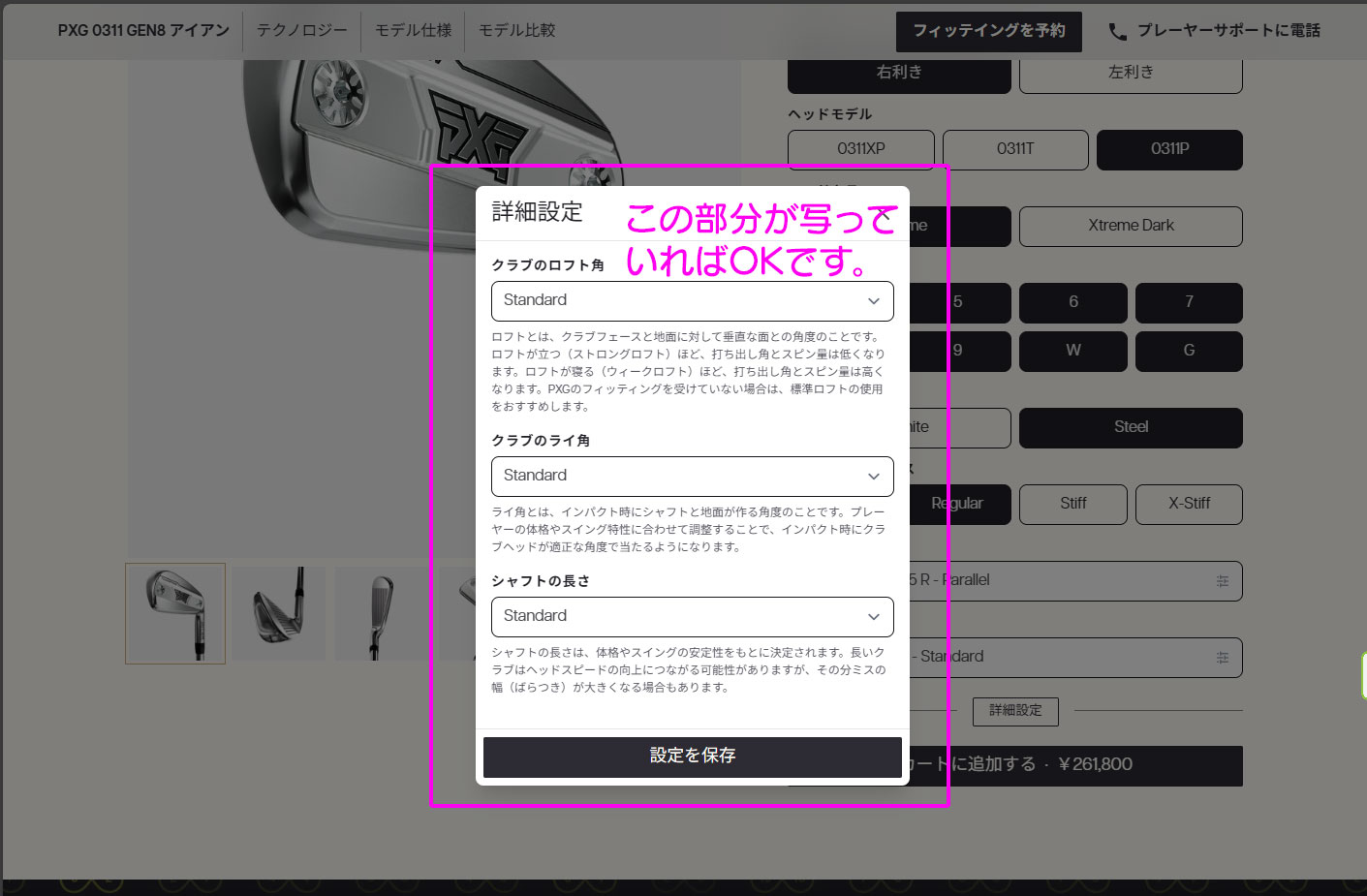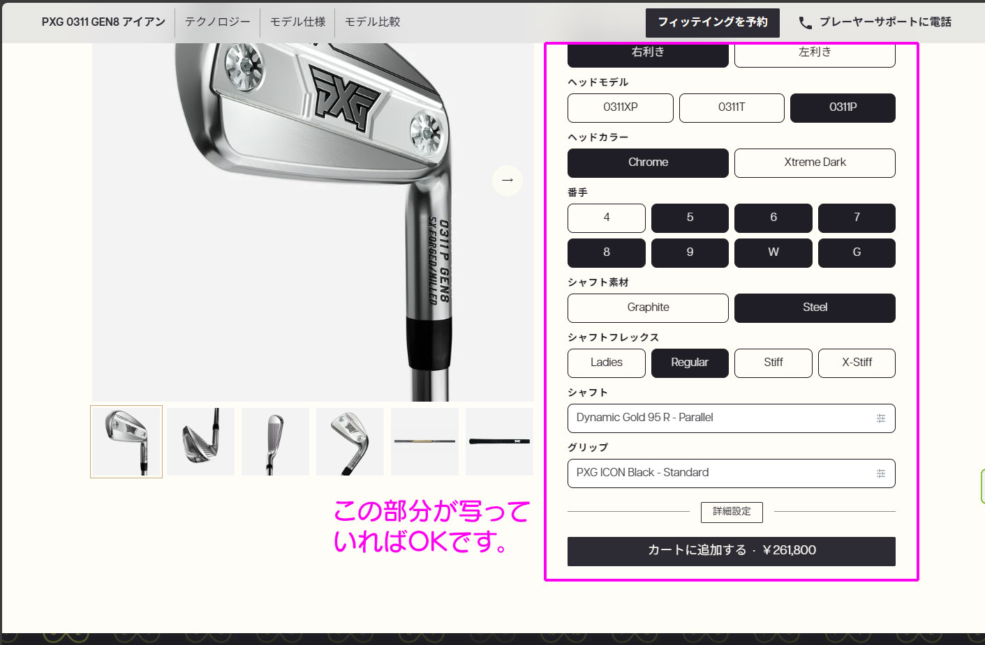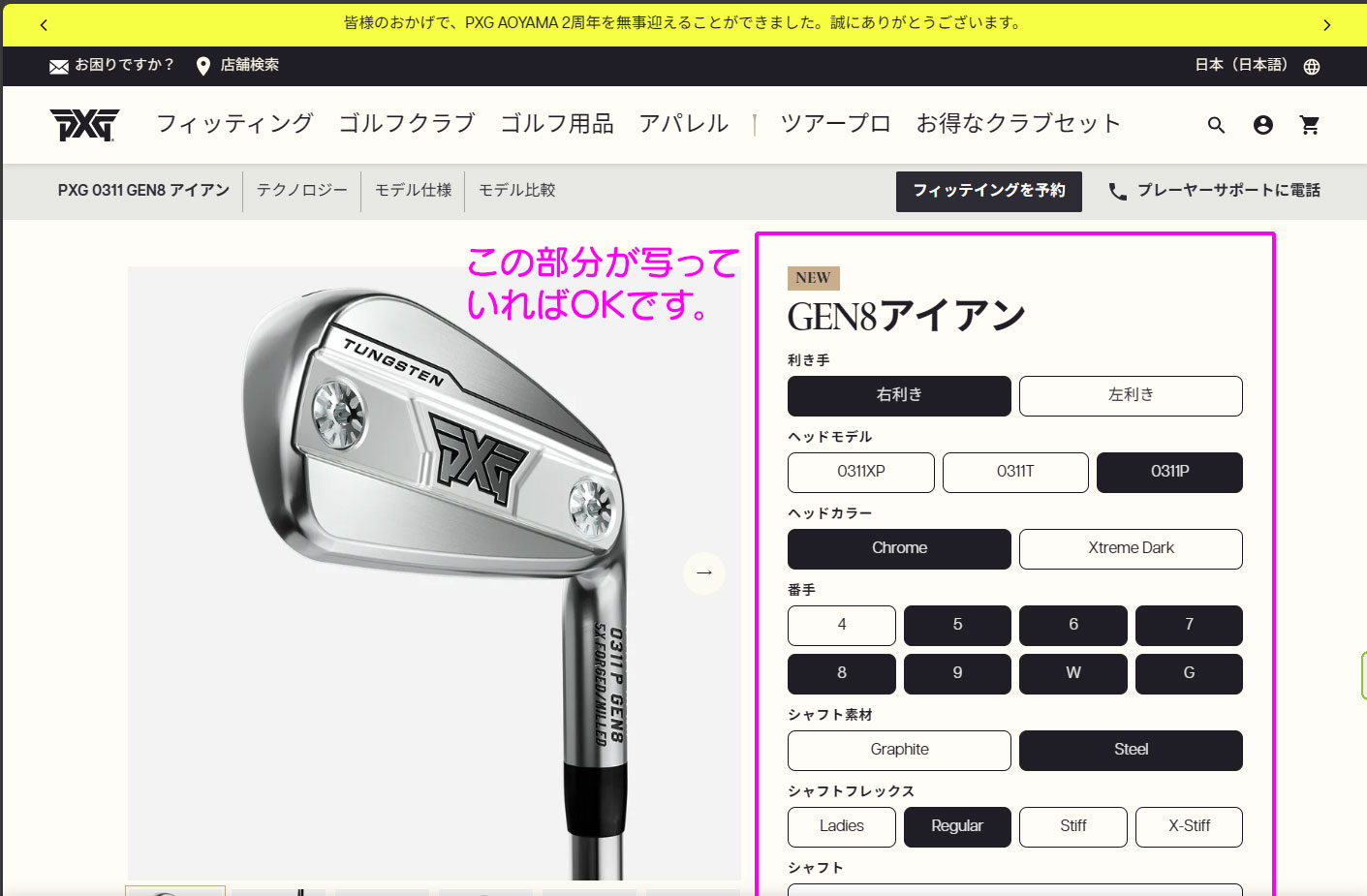 (1)PXG公式ウェブサイトで購入されたいクラブのページを開きます。